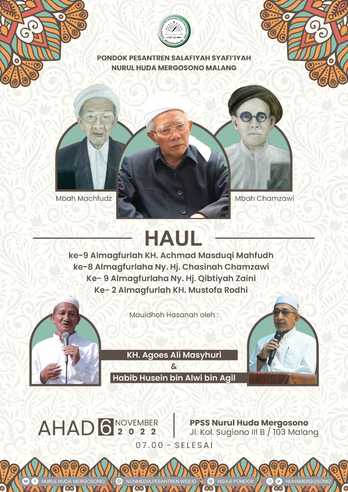 Salam silaturrahim kami sampaikan kepada keluarga besar Alumni dan wali santri PPSSNH Mergosono Malang. Kami atas nama Pengurus Alumni PPSSNH mengharap dengan hormat para Alumni PPSSNH (seluruh angkatan) dan wali santri dalam acara HAUL KE-11 Murobbi ruuhina ABAH KH. Drs. AHMAD MASDUQI MAHFUDZ Beserta HAUL KE-10 UMI NYAI Hj. CHASINAH HAMZAWI yang insya Allah akan dilaksanakan pada: